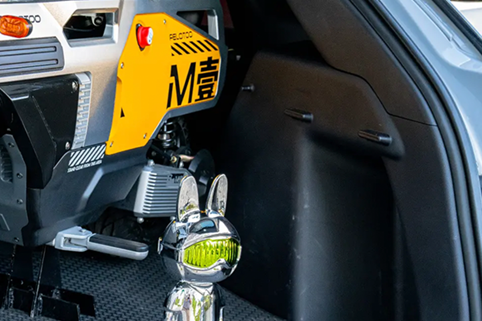 It’s foldable, and it’s made to fit inside the trunk or hatch of a car It has a wheelbase of 800 millimeters, or just under 31.5 inches. Length is 1,160 mm (45.7 in.), width is 560mm (22 in.), and vehicle height is 860mm (33.85 in.).